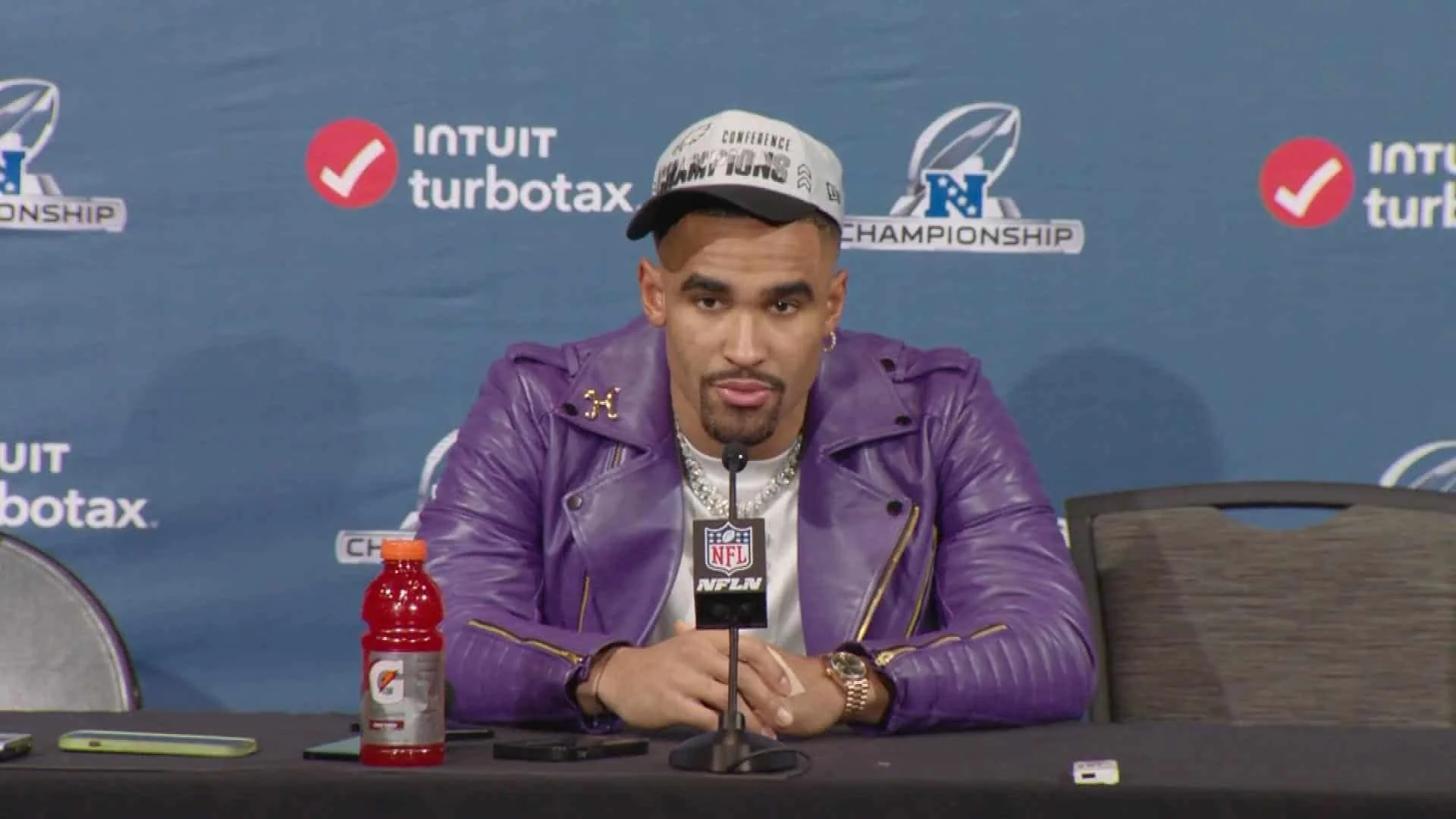 Now let’s say the game is over (Eagles won by a million), and Jalen Hurts is doing a press conference.